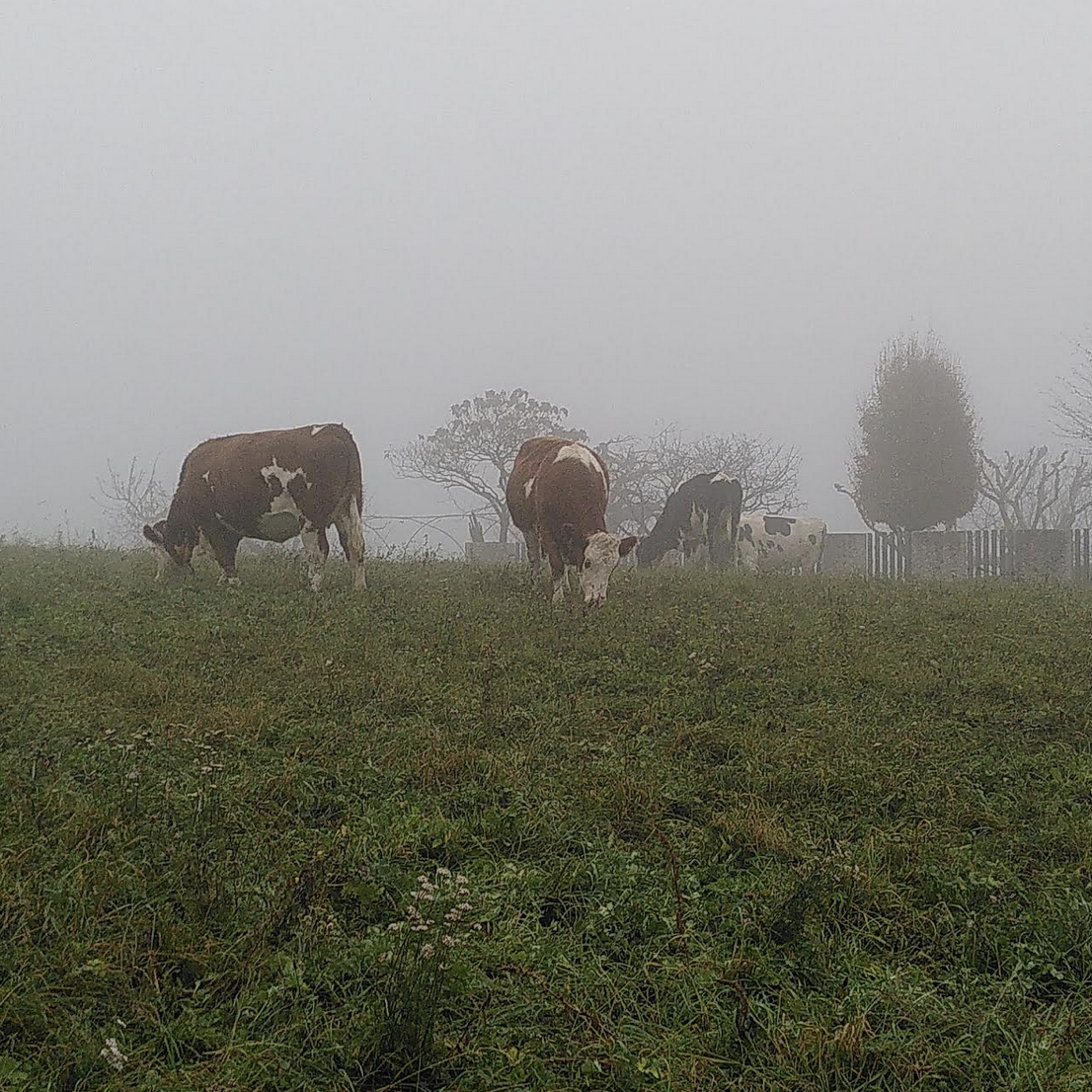 Cows grazing in the fog, Cerro, on the Lessini Mountains, North of Verona, Italy in late November 2025 – by Davide Erbogasto